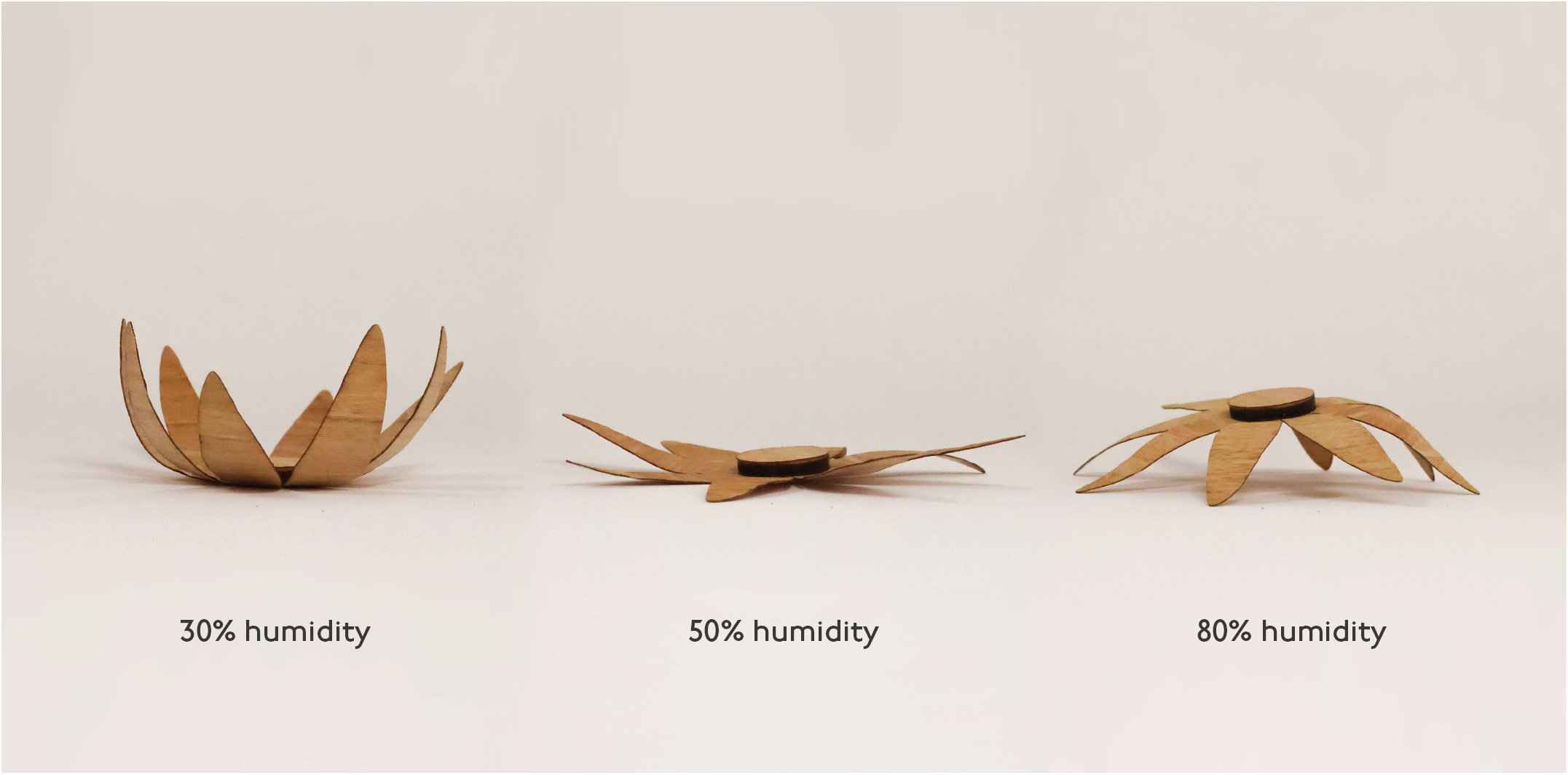 Moisture-responsive wood veneer is a material that shows a repeated dynamic bending response under changing humidity levels. It is made from oak wood veneer with a wood glue coating on one side. Through a specifically designed manufacturing process, the natural curvature response of wood to moisture is enhanced.