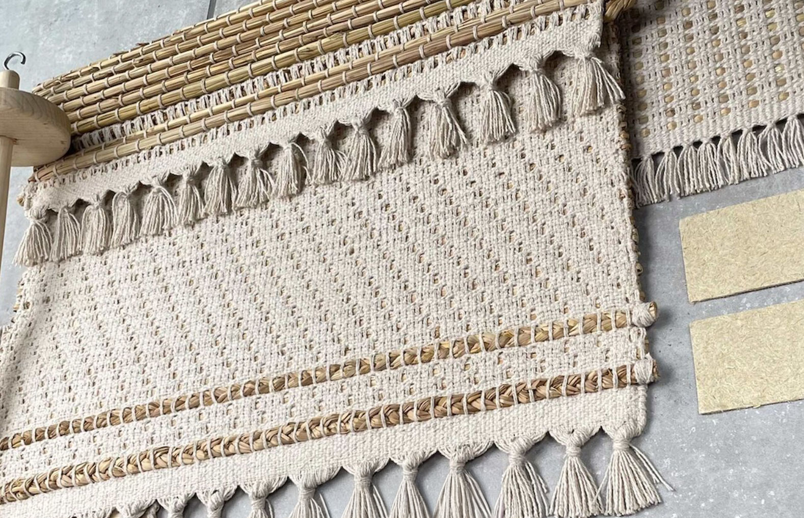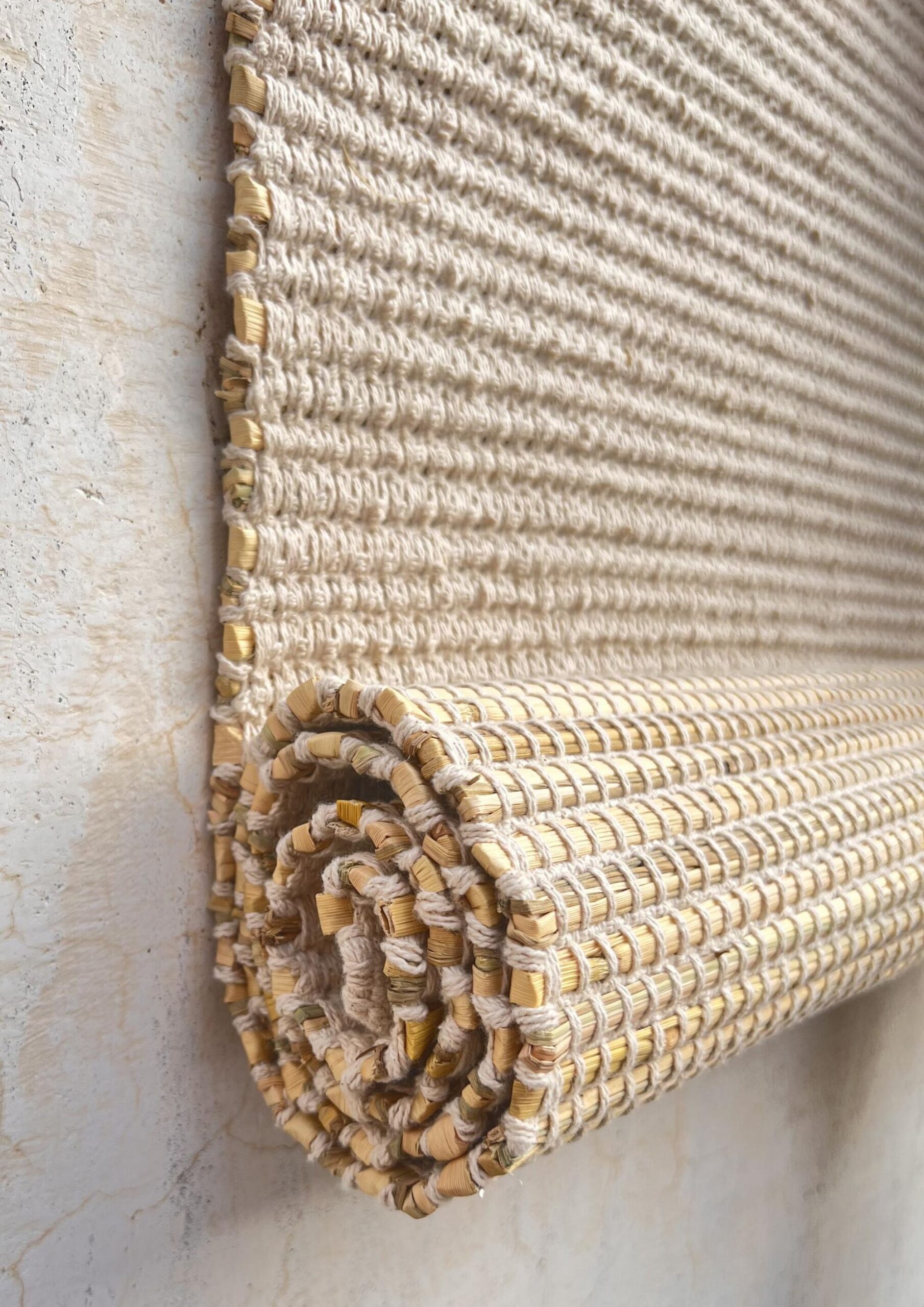 The resulting textile applications combine rice straw with organic cotton and are used in interior and lifestyle products such as coasters, table runners, table mats, rugs, blinds, chair cushions and wall hangings. Many products are customisable in size and detailing, with finishes including hand knotting and stitching.